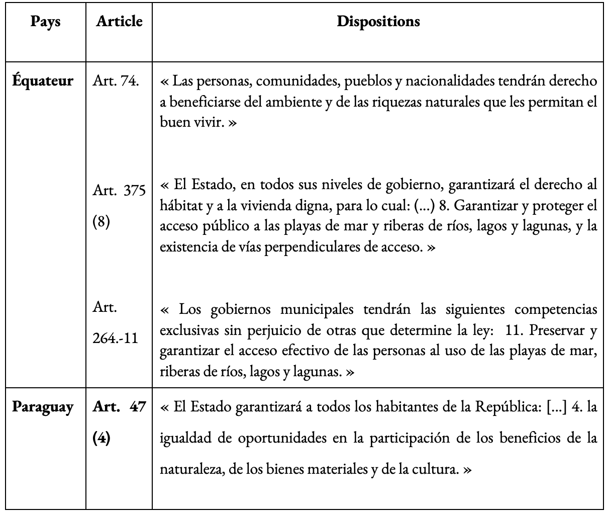On le voit à l'évocation de ces deux affaires, il faudrait que le juge estime que l'accès à la nature relève d'une liberté fondamentale aussi éminente que l'est la liberté d'expression. Comme l'a montré Sarah Vanuxem, la Charte de l'environnement est une ressource précieuse, même si elle ne pose pas expressément, l'accès à la nature. Nous voudrions terminer par un tableau des constitutions qui reconnaissent un droit d'accès à la nature, pour expliquer le saut qu'il reste à faire entre le droit de l'environnement, les droits de la nature et le droit des humains à y accéder.